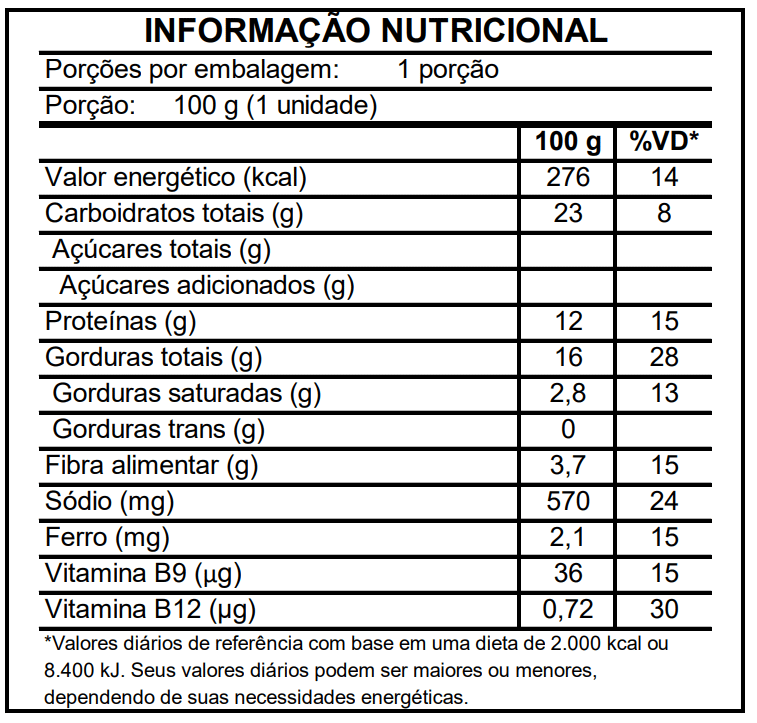 Água, óleo de soja, farinha de milho, farinha enriquecida com ferro e ácido fólico, proteína de soja, proteína de ervilha, glúten de trigo, farinha de arroz, amido modificado, sal, especiarias (alho e cebola), ferro, vitamina B9, vitamina B12, estabilizantes: metilcelulose, goma xantana, goma jataí, carragena, cloreto de potássio, e aroma natural
